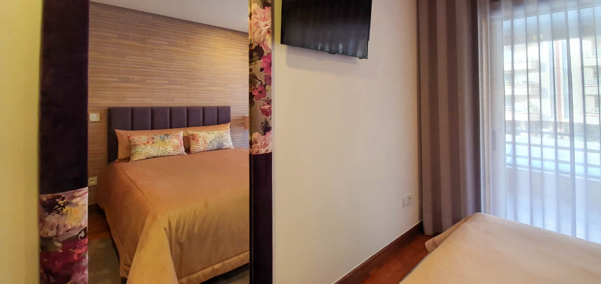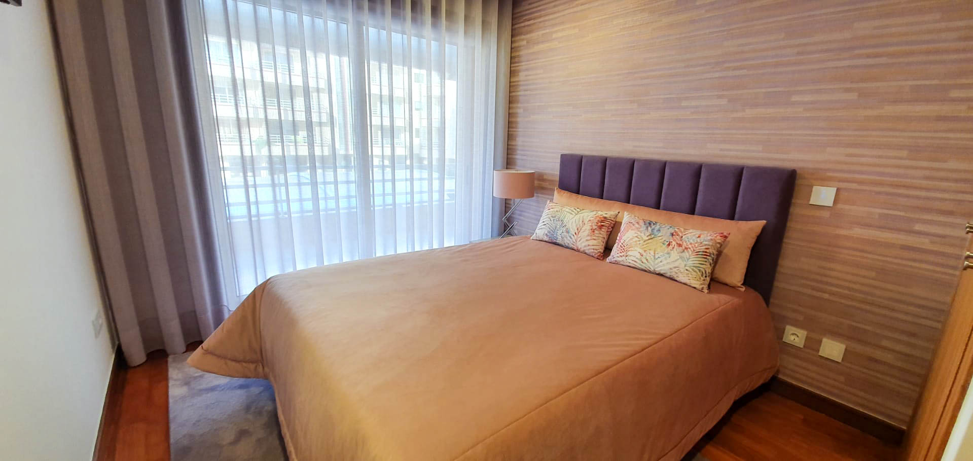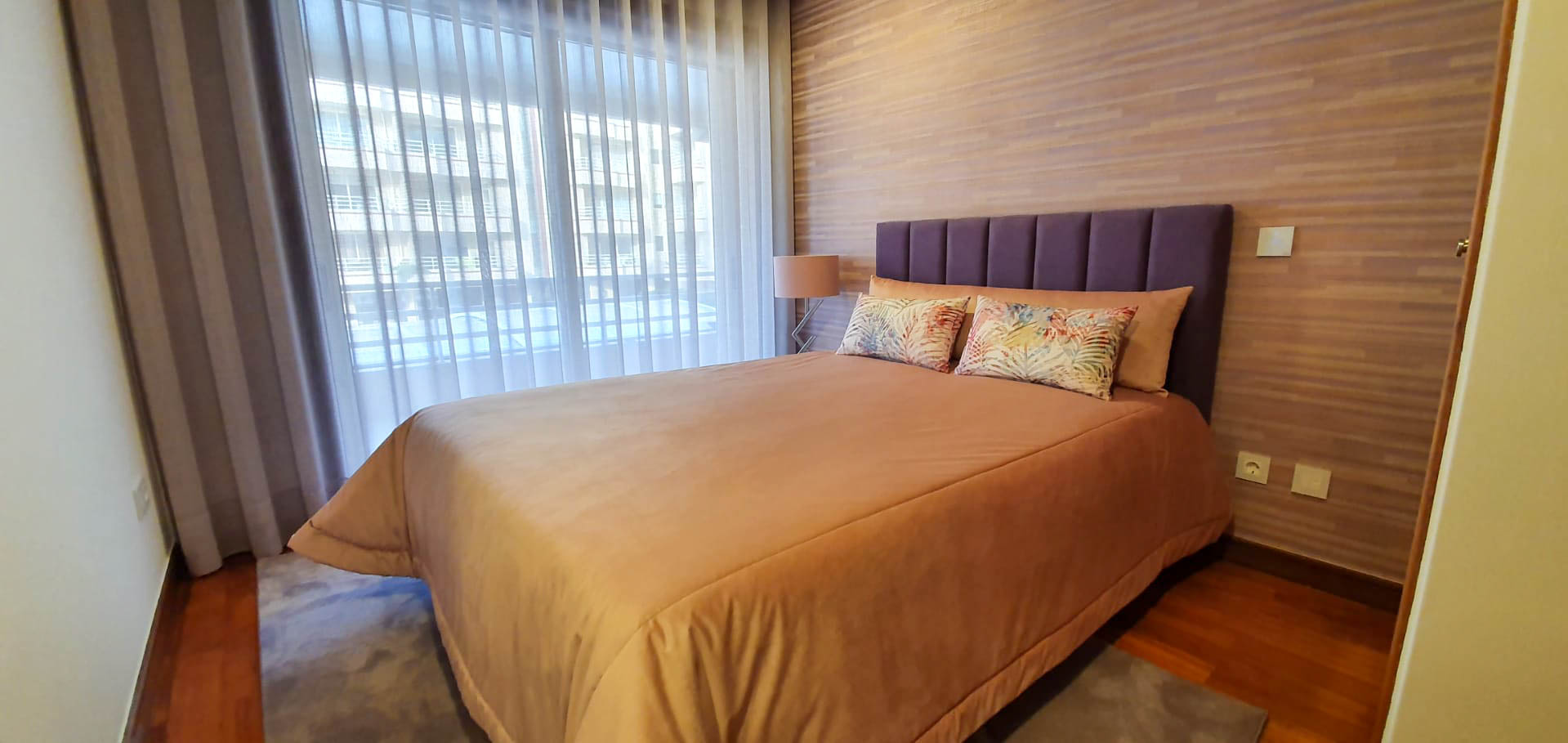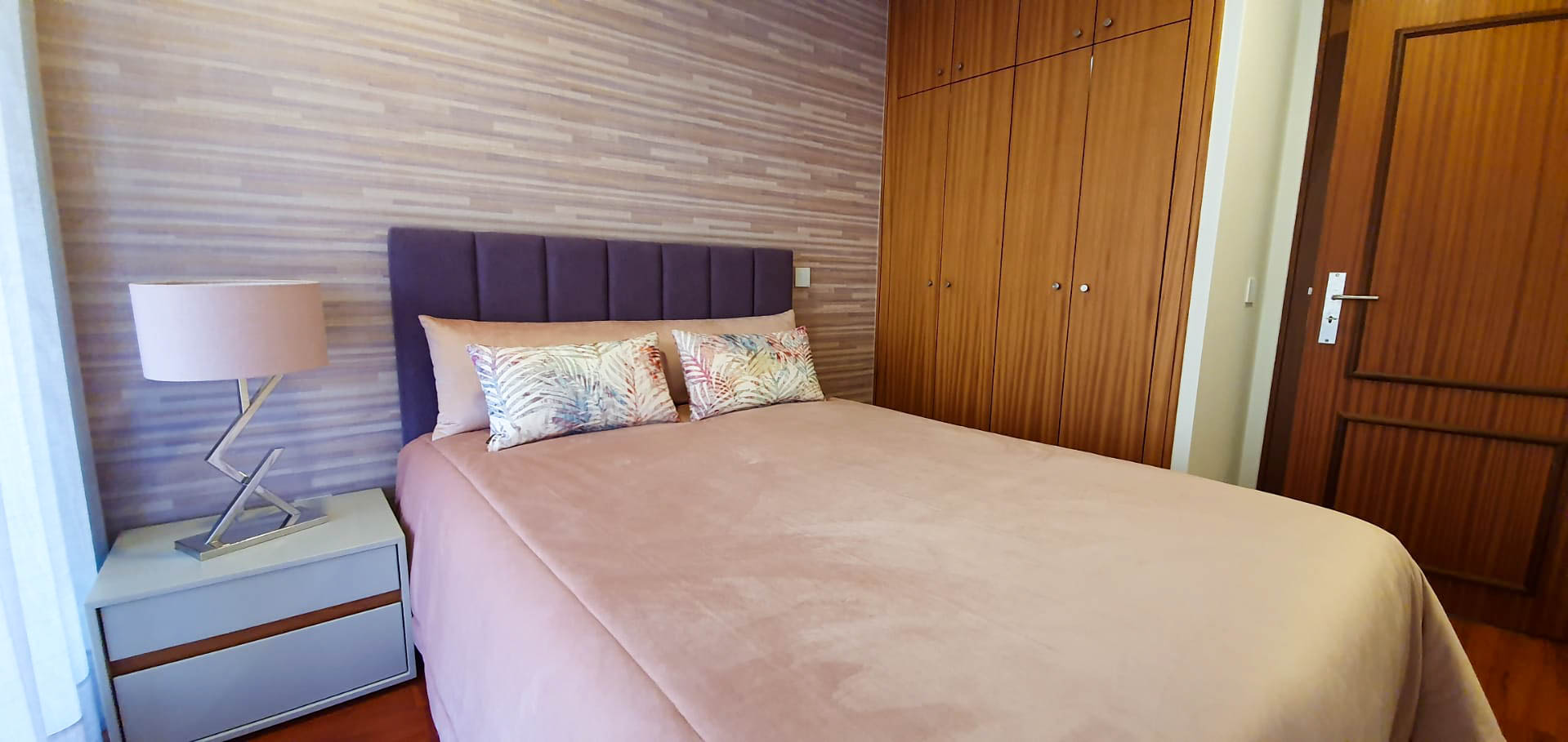 O projeto consistiu na execução de mobiliário personalizado, na confeção da cortina, do abat-joure do edredon, na estofagem da cama e na escolha e aplicação do papel de parede.