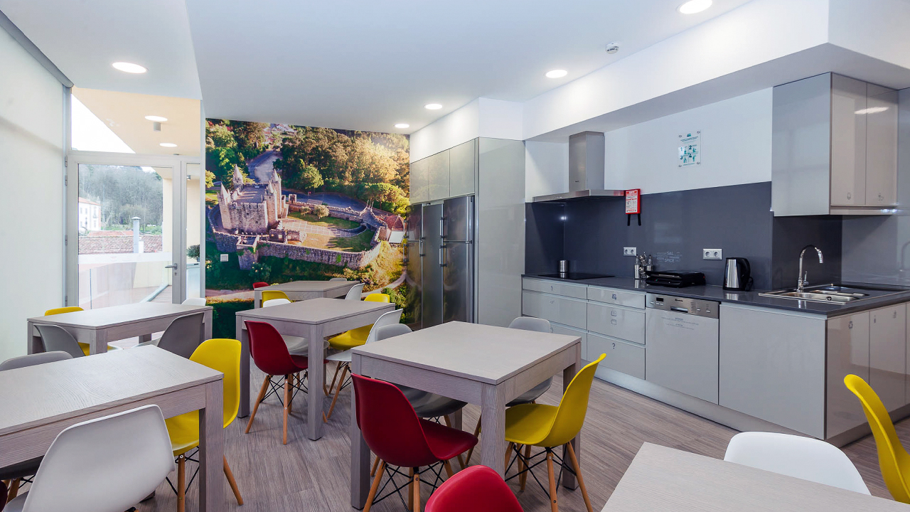 Na cozinha partilhada está uma imagem dos Castelo de Santa Maria da Feira como se de uma janela com vista para o castelo se tratasse.